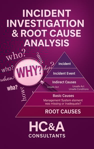 Using structured methods like the 5 Whys and Root Cause Analysis, we investigate incidents thoroughly and provide detailed reports with actionable prevention strategies in line with OHSA.